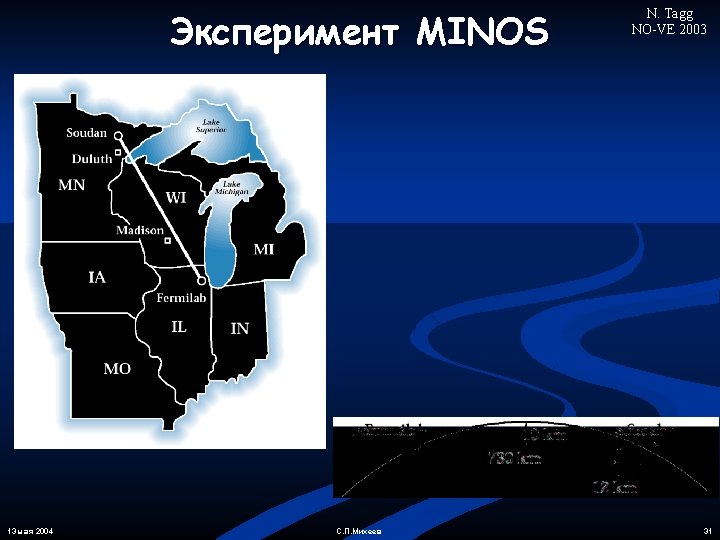 Эксперимент MINOS N. Tagg NO-VE 2003 Far Detector 485 planes of scintillator + steel 8 m x 8 m octagon 5. 4 k. T total mass BOTH: Steel/Scintillator sandwiches 2. 54 cm steel + 1 cm scint Magnetized ~1. 5 T 55%/ E hadrons 23%/ E electrons Near Detector 282 steel + 153 scintillator planes 3. 8 m x 4. 8 m 0. 98 k. T total mass 13 мая 2004 С. П. Михеев 32