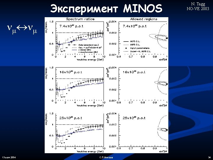 Эксперимент MINOS N. Tagg NO-VE 2003 CC Events/kt/3. 7 e 20 pot Low Medium 440 1040 High 2170 CC Events/MINOS/7. 4 e 20 pot Low Medium High 4760 11300 23400 3. 7 x 1020 protons on target/year requires 4 x 1013 protons/2. 0 seconds Osc. Max. for m 2 = 0. 002 e. V 2 By moving the horns and target, different energy spectra are available using the Nu. MI beamline. The energy can be tuned depending on the specific oscillation parameters expected/observed. 13 мая 2004 С. П. Михеев 33