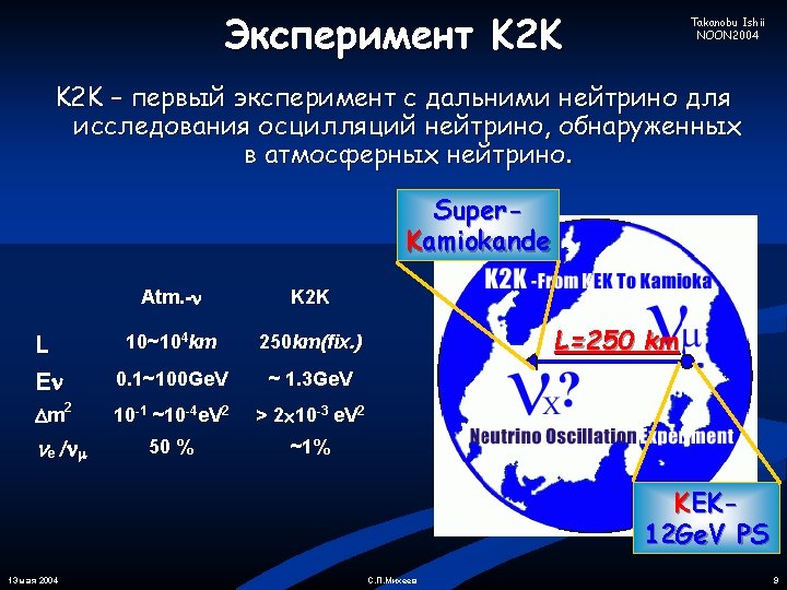 Эксперимент K 2 K Takanobu Ishii NOON 2004 Use both Number of events + Spectrum shape (June ’ 99 – July ’ 01) (Nov. ’ 99 – July ’ 01) 56 obs 80. 1+6. 2 -5. 4 exp Null oscillation probability: less than 1% m 2=1. 5~3. 9 x 10 -3 e. V 2 @sin 22 =1(90%CL) Allowed region reconstructed E Normalized by area Expectation w/o oscillation Best fit point 2. 8 x 10 -3 Best Fit 68% 90% 99% 13 мая 2004 С. П. Михеев 10