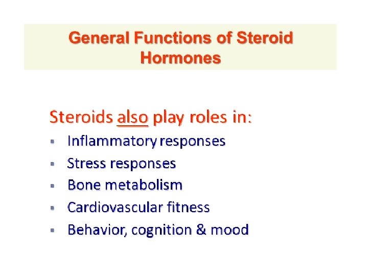 Steroid Hormones • Hormones act as chemical messengers • They are important in control of many biological functions • They are secreted from endocrine glands (and placenta) • They react with receptors on cell surfaces to trigger a cascade response • Usually control metabolism at the gene level • Steroid hormones are biosynthesized from cholesterol