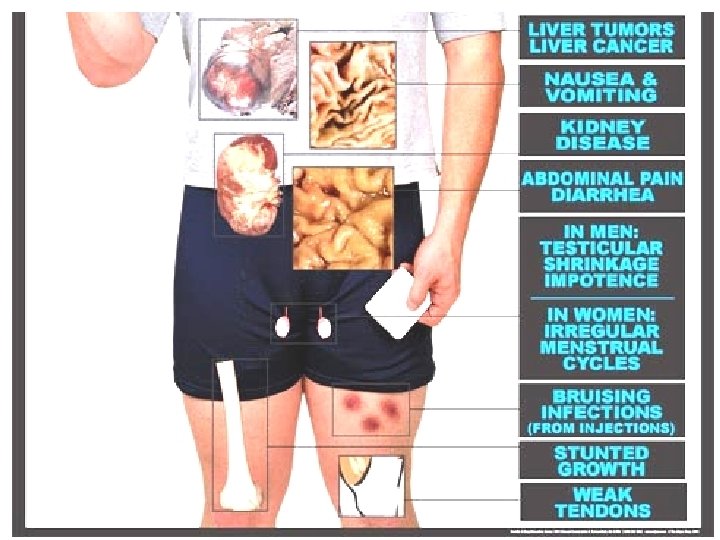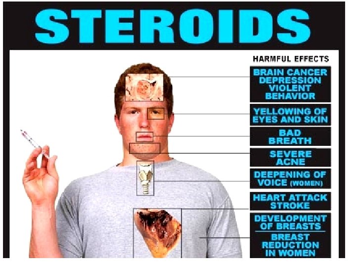 Negative Effects, cont. • Injecting users subject themselves to Hepatitis or HIV. • Withdrawal symptoms when one stops using steroids: mood swings, fatigue, restlessness, loss of appetite, insomnia, reduced sex drive, and depression. • Depression can lead to suicide. • If untreated, the withdrawal symptoms could last up to a year after stopping the use.