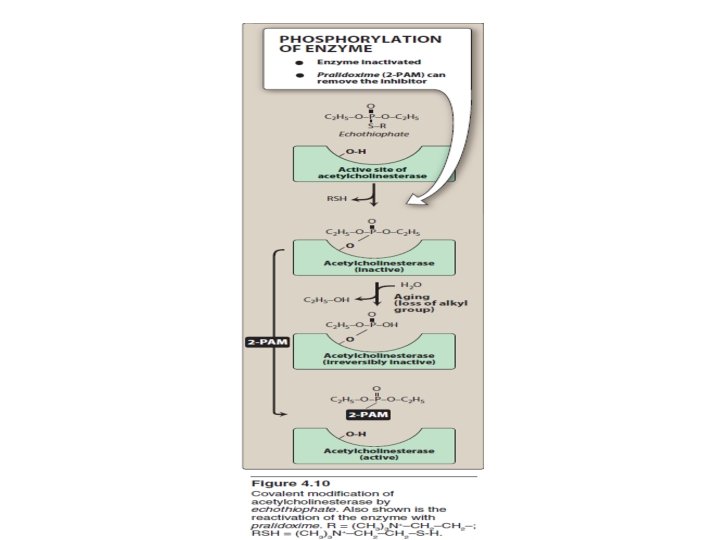 These drugs are extremely toxic and used in military as nerve agents (soman, sarin, VX), some agents like parathion and malathion used as insecticides. The covalent phosphorus-enzyme bond is extremely stable and hydrolyzes in water at a very slow rate (hundreds of hours). After the initial binding-hydrolysis step, the phosphorylated enzyme complex may undergo a process called aging.
