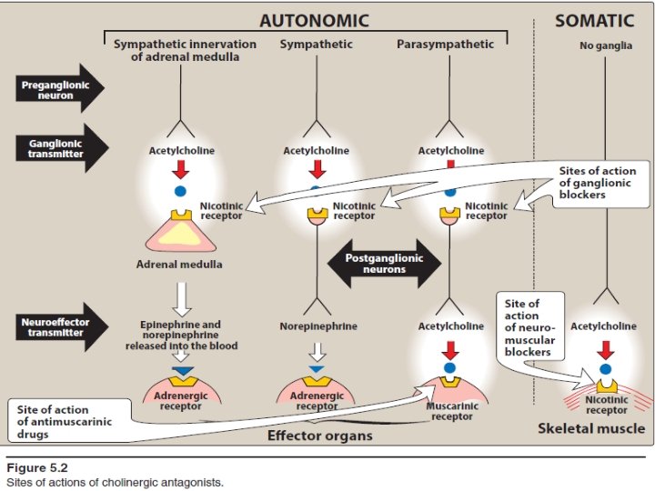 Antimuscarinic agents: These agents block muscarinic receptors and inhibit muscarinic functions, they are useful in different clinical situations, they have no actions on skeletal neuromuscular junctions or autonomic ganglia because they do not block nicotinic receptors.