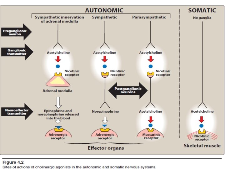 q. Are drugs act on receptors that are activated by acetylcholine(ACH) which is the neurotransmitter of the parasympathetic nervous system. ACH is synthesized in the cholinergic neurons from choline and acetyl Co. A then stored in synaptic vesicles then it will be release into synaptic gap to bind post synaptic receptors and lead to biological response. ACH is metabolized by acetylcholine esterase enzyme that cleaves it to choline and acetate. Choline will be recaptured by uptake system back into the neuron and recycling will occur.