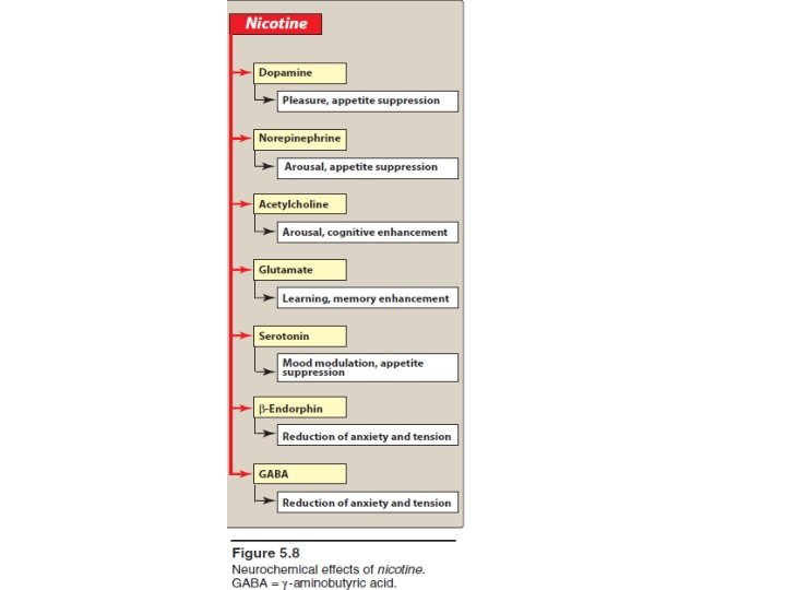 Nicotine It is component of cigarette smoke, has many undesirable actions. • Depending on the dose, nicotine depolarizes ganglia resulting first in stimulation then followed by paralysis of all ganglia. • The stimulatory effects are complex include ( at low dose ): 1 - Increase in blood pressure and heart rate (due to release of the transmitter from adrenergic terminals and adrenal medulla). Increase peristalsis and secretions. •