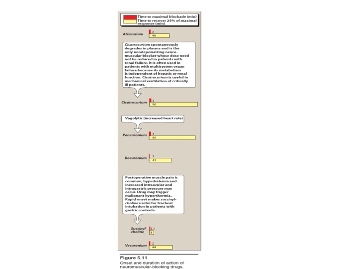 Drug interactions: – Cholinesterase inhibitors: They can overcome the effect of nondepolarizing NM blockers at high doses. – Haloginated hydrocarbone anesthetics: Enhance their actions by exerting stabilizing action at the NMJ. – Aminoglycoside antibiotics: Inhibit ACH release from cholinergic nerves by competing with calcium ions, they synergize with all competitive blockers and enhance the blockade. – Calcium channel blockers: Increase the effect of both depolarizing and nondepolarizing agents.