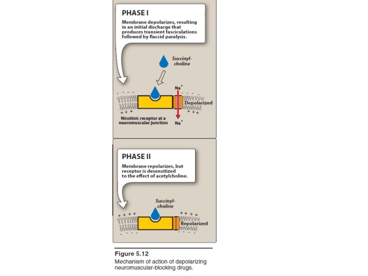 Depolarizing agents: Mechanism of action: • Succinylcholine attach to nicotinic receptors and acts like acetylcholine to depolarize NMJ. • This drug persist at high concentration at synaptic cleft and attach to the receptor for long time, it cause initially opening of the sodium channel associated with the nicotinic receptor which cause receptor depolarization and this lead to transient twitching of the muscle (fasciculation). • The continuous binding of the agent to the receptor renders the receptor incapable to transmit further impulses, then there will be gradual repolarization as the Na+ channels will be closed and this causes resistance to depolarization and a flaccid paralysis.