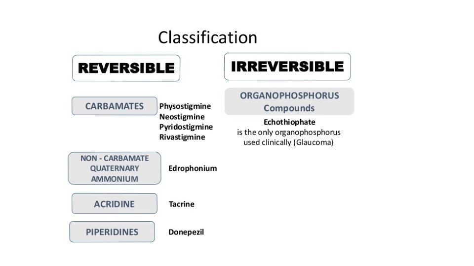 Other : • Pyridostigmine ; slower onset and less potent • Edrophonium : less potent but the most rapid onset of action and shortest duration. • Physostigmine ; lipid soluble so can cross BBB(the only one)