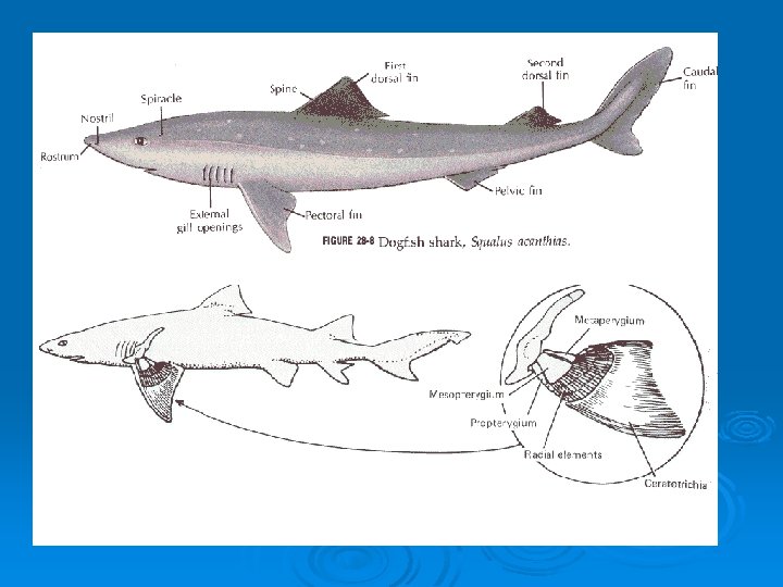 Digestive System with stomach and intestine with a spiral valve. Ø 7. Body fusiform with heterocercal caudal fin. 8. Mesonephric Kidney and rectal gland: the rectal gland helps control salt concentrations in the blood by secreting a colorless fluid high in sodium chloride. 9. No swim bladder or lung. Sharks have high amounts of lipids fats in their liver that help them be bouyant. Ø 6.