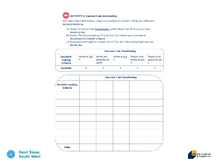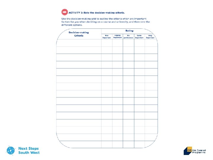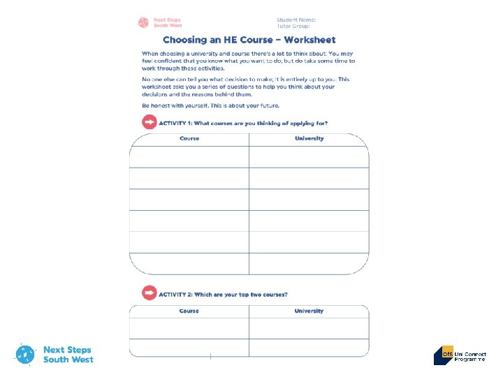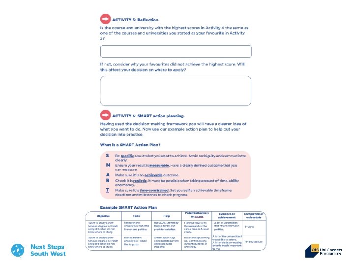 An example: Objective Tasks Help Potential barriers to success Evidence of achievement I want to study a joint honours degree in French and politics but do not know where to study. Research the universities that offer French and politics. Use UCAS, university league tables, and provider websites. Limited time to do this research at the same time as A-level study. A comprehensive list of universities that offer both French and Politics. I want to study a joint honours degree in French and politics but do not know where to study. Find out which universities I would like to go to. Attend open days and speak to current undergraduate students. No open days coming up. Don’t know any current students at university. A list of five universities I would like to attend. A list of decision -making criteria that is important to me. Completion or review date 3 rd June 15 th September