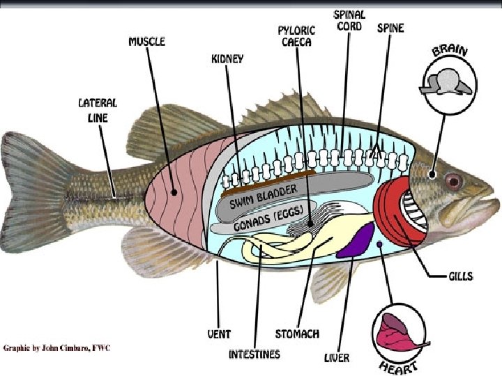 Organ systems in fish • Fish may be herbivores, carnivores, parasites, filter feeders, detritus eaters • Esophagus, stomach, pyloric ceca, liver, pancreas, anus