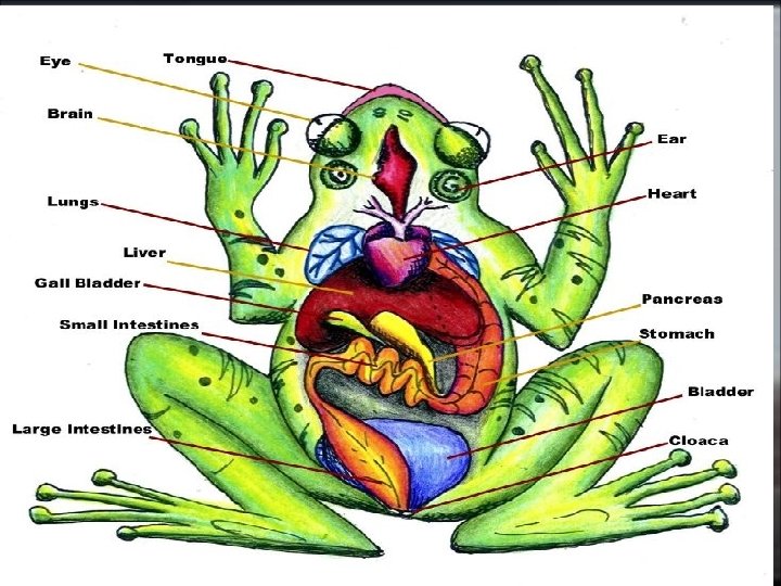 Amphibians-anatomy -digestion • Tadpoles filter feeders and eat algae/adults meat eating • Mouth, esophagus, stomach, small intestines(food absorption), large intestine, , cloaca(for urine , wastes and eggs or sperm), liver, pancreas, gall bladder