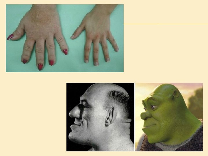 GIGANTIZMUS somatotropný hormón (STH) - hormón adenohypofýzy koncentrácia klesá redukciu RNA syntéza bielkovín nadbytok STH - nadmerný vzrast = gigantizmus nedostatok STH - trpasličí vzrast = nanizmus zvýšená produkcia STH - neproporčný rast vrcholových častí = akromegália