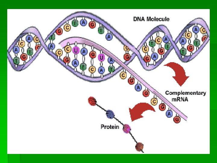 Transcription § Enzymes make an RNA copy of a DNA strand. Results in the formation of a single stranded RNA molecule § Messenger RNA (m. RNA)- the RNA copy that carries the information from DNA out into the cytoplasm of the cells § Carries info to the ribosomes so that proteins can be synthesized
