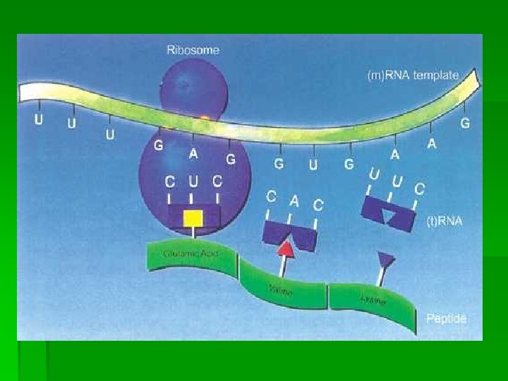 Translation § The process of converting the information in a sequence of nitrogen bases in m. RNA into a sequence of amino acids that make up a protein § Occurs on the ribosomes § Transfer RNA (t. RNA)- brings amino acids to the ribosomes so they can be assembled into proteins § Each m. RNA codon (3 letters) joins w/the anticodons of t. RNA § End result of translation is the production of proteins