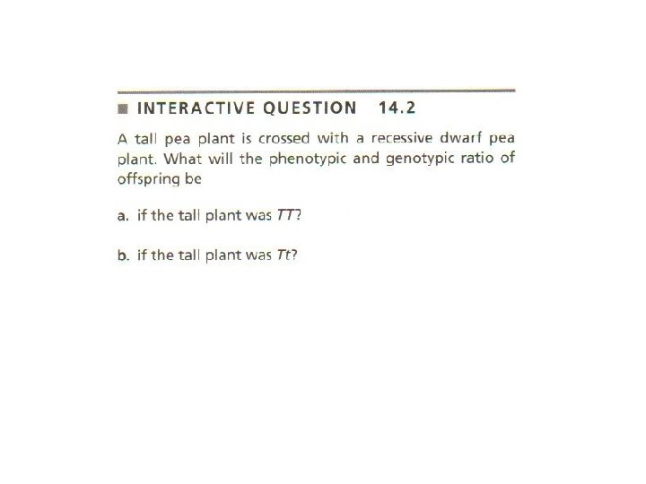 100% tall 100% Tt 1 tall : 1 dwarf T T T 1 Tt : 1 tt t t Tt Tt tt