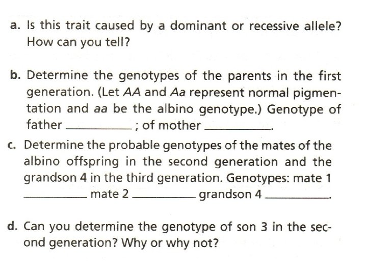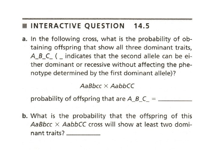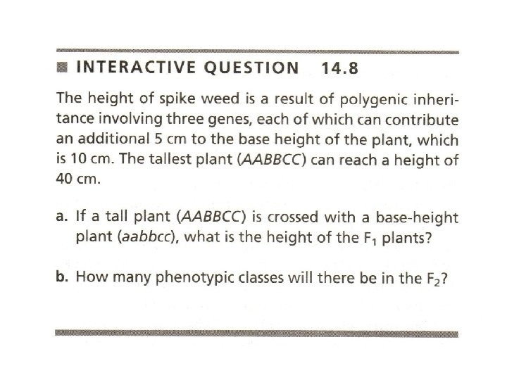 Polygenic = additive effect of 2 or more genes on one phenotype aabbcc Aa. Bb. Cc Aa. Bbcc Aa. Bb. Cc AABBCc AABBCC 20/64 15/64 Fraction of progeny Ex: skin color height Aa. Bb. Cc 6/64 # alleles + 1 = # phenotypes 1/64