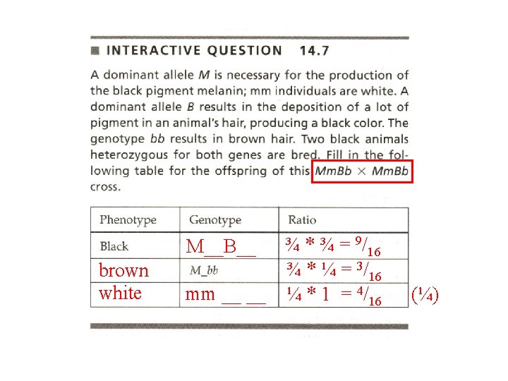 Epistasis = (“force upon”) one gene affects the expression of another gene Bb. Cc Sperm 1 1 1 Ex: coat color in mice Bb. Cc 1 1 4 BC 1 4 b. C 1 4 Bc 1 4 bc 4 BC BBCC Bb. CC BBCc Bb. Cc 4 b. C Bb. CC bb. CC Bb. Cc bb. Cc 4 Bc BBCc Bb. Cc BBcc Bbcc 4 bc Bb. Cc bb. Cc Bbcc bbcc 9 16 3 16 4 16