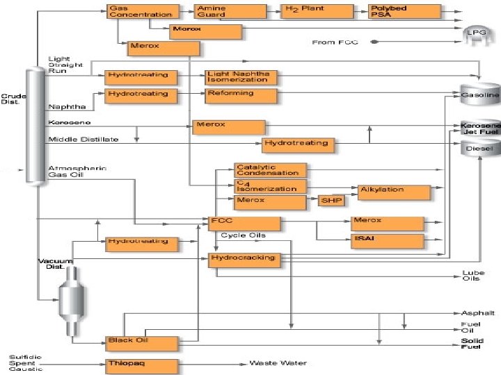 The refining process Every refinery begins with the separation of crude oil into different fractions by distillation. v The fractions are further treated to convert them into mixtures of more useful saleable products by various methods such as; q Cracking q Reforming q Polymerisation q. Alkylation q Isomerisation v These mixtures of new compounds are then separated using methods such as; q Fractionation q Solvent extraction v Impurities are removed by various methods, e. g. q Dehydration q Sulphur removal q Desalting q Hydrotreating