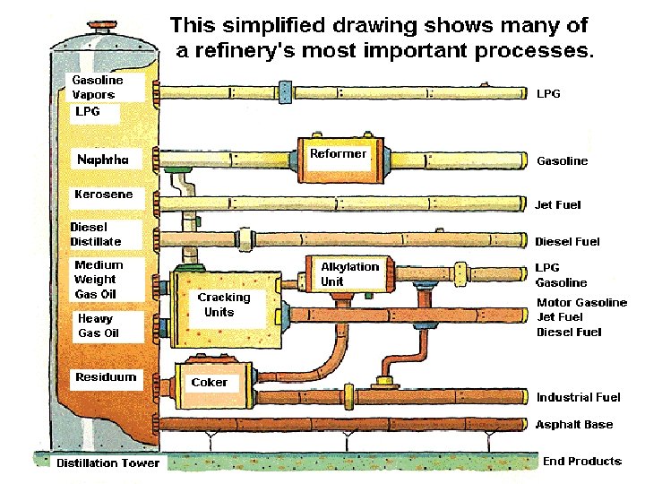 What is Petroleum (Crude oil)? q In the refinery, the various "fractions" of the crude oil (gases, liquids, and solids) are separated from each other (and sometimes modified in composition) before they are distributed for use. q The liquid fractions are primary components of gasoline, diesel fuel, and lubricating and heating oils. The very large hydrocarbon components are solids at room temperature and are used for roofing and road surfaces -- tar and asphalt.