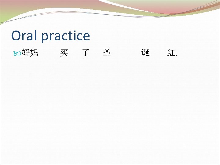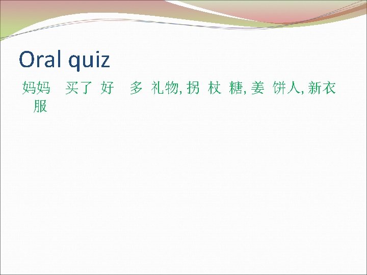 Monday’ sentences māma mǎi le hǎo duō lǐ wù guǎi zhàng táng jiāngbǐng rén xīn yī fu 。 妈妈 买了 好多 礼物, 拐 杖 糖, 姜 饼 人, 新衣 服。 Pass to get out of the class Please say the sentence to me and you can line up by the door and listen to your music.
