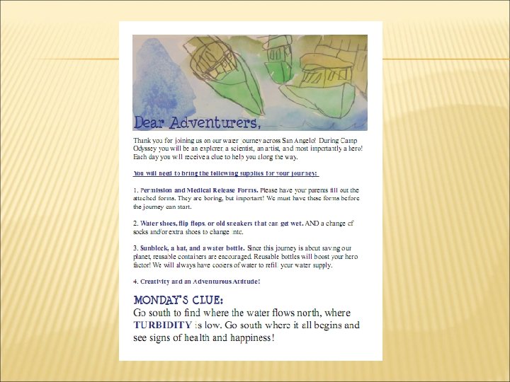 WHAT’S THE STORY? San Angelo ISD– wanted an intense project focused summer camp modeling the Texas Research Institute for Young Scholars program. PLUS relationships built with teachers/principals San Angelo Museum of Fine Arts – practices “Art in the community with an interdisciplinary approach” UCRA – looking for a more systemic way to approach water issue. City of San Angelo – didn’t realize it needed to do this, honestly.