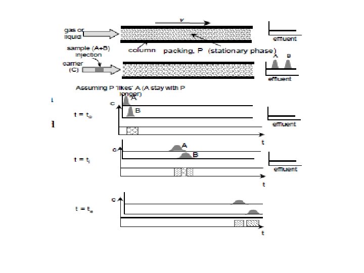 Principle The level of Interaction (adsorption) packing material & sample A, B differs, resulting in different speeds of travel of A & B in a media (paper, column etc. ). Usually sample to be analyzed is injected into a carrier (gas or liquid). Carrier is usually inert (does not react with packing materials). The components in sample, being separated after chromatography, are analyzed. Types of chromatography LC - Liquid (carrier & A, B) Chromatography GC - Gas (carrier & A, B) Chromatography HPLC - High Pressure Liquid Chromatography TLC – Thin Layer Chromatography Paper Chromatography