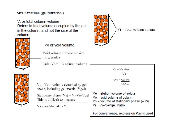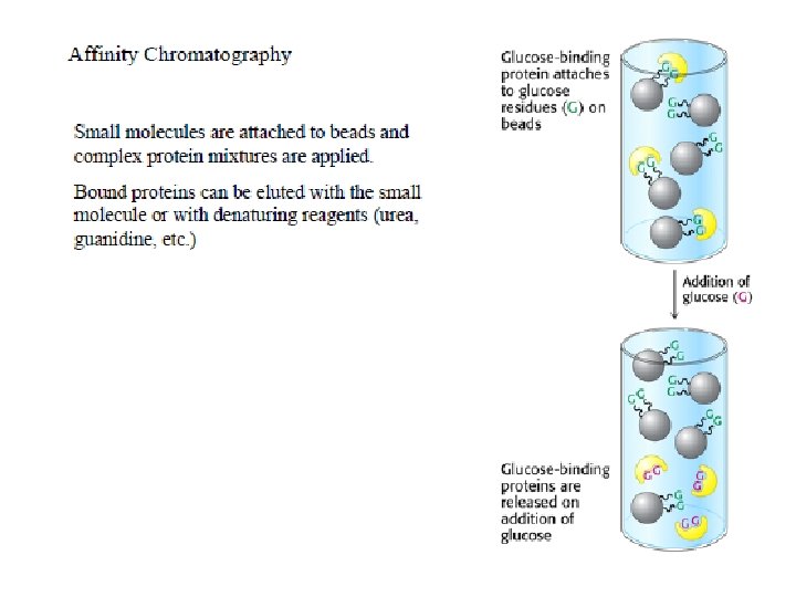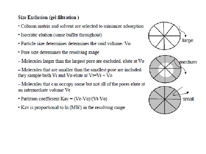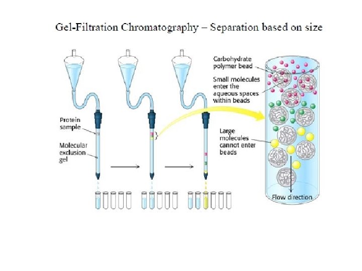 Gel-filtration chromatography: (aka: size exclusion) particles are separated based on size. The separation is carried out on the basis of hyrdodynamic diameter of the molecules. [large molecules exit (elute) first] Ion-exchange chromatography: The mechanism of ion-exchange used allows the separation of analytes based on charge. Separation of charged compounds takes place through a charged stationary phase. Least charged particles will elute first. (two different modes: column and planar) Affinity chromatography: particles are passed through a column of beads containing a covalently bound high affinity group for the particle of interest. Bound particles are eluted by free high affinity group.