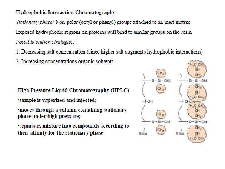 Gas chromatography: the analyte is moved through the column via a high pressure gas (like helium). Flame ionization detectors (mass spec. ) and thermal conductivity (pyrolysis) are used to evaluate the separated particles. Reverse-Phase chromatography: the stationary phase is made of hydrophobic compounds; they attract the hydrophobic compounds in the mobile phase allowing the elution of the hydrophobic particles. Thin Layer chromatography: particles are separated using a stationary phase of paper, it involves a stationary phase of a thin layer of adsorbent like silica gel, alumina, or cellulose on a flat, inert substrate.
