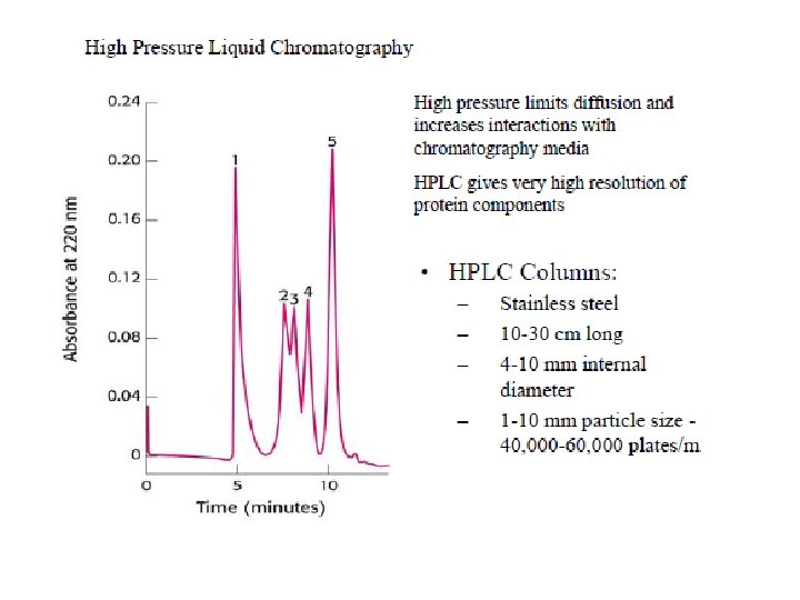 Adsorption chromatography: the analyte is passed over an adsorbent bed. Different compounds present in the mixture get adsorbed onto the bed at different rates. [large molecules exit (elute) first] Partition chromatography: Components of the analyte are separated through the use of partitions of a solute between two solvents. In this process one of the solvents is immobilized by the means of a substance present in the filter paper or column. High Performance Liquid chromatography: particles are separated on the basis of their idiosyncratic polarities. Interaction of these particles with the stationary phase of the column is also considered for analysis. A pump is used to push the mobile phase through the column. There is a detector following the stationary phase to analyze the retention time of the various particles.