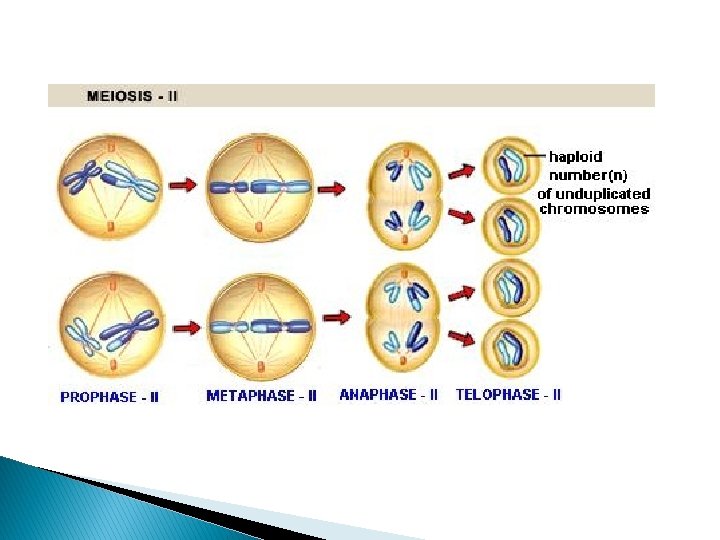 Cells go through two rounds of division in meiosis � Meiosis is a form of nuclear division that created four haploid cells from one diploid cell � Broken down into Meiosis I and Meiosis II � Each round of cell division has four phases, which are similar to those in mitosis