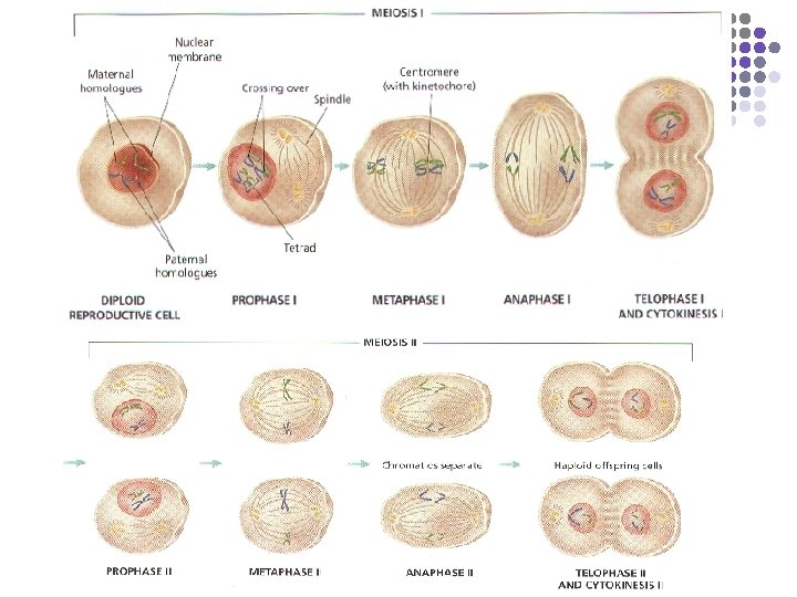 II. The Phases of Meiosis In meiosis, cells divide twice after a single DNA duplication. Meiosis I – Separates homologous (like) chromosomes. 1. Prophase I a. Chromosomes coil tightly & are visible b. Nuclear membrane & nucleolus disintegrate c. Spindle forms d. Synapsis (joining) of homologous chromosomes occurs making tetrads (groups of 4 chromosomes) 2. Metaphase I a. Tetrads become aligned in the center of the cell attached to spindle fiber b. Chromosomes in tetrad exchange fragments by a process called Crossing-Over (reason daughter cells are NOT identical) 3. Anaphase I – Homologous chromosomes separate 4. Telophase I a. May not occur in some species b. Cytokinesis occurs producing 2 cells c. In females, the 2 nd cell or first polar body dies due to uneven splitting of the cytoplasm