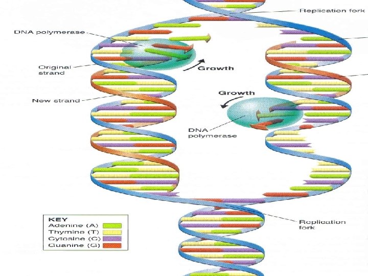 DNA replication: 1) DNA molecule separates into 2 strands • Each strand of the double helix of DNA serves as a template (model) for the new strand 2) Produce 2 new complimentary strands by base pairing § DNA replication results in two DNA molecules each with one new strand one original strand