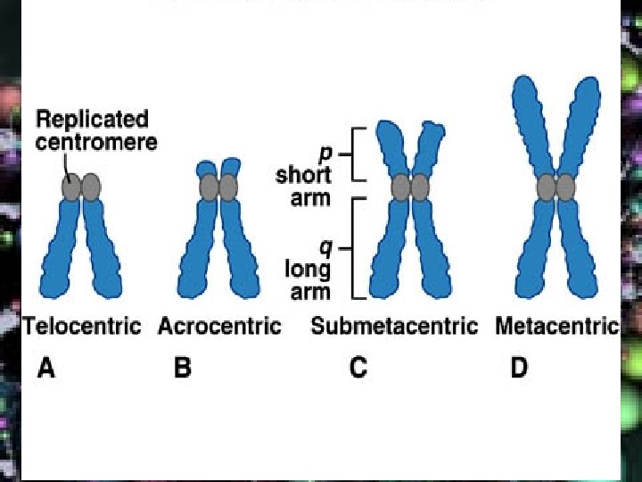 • According to the position, centromere can be classified as: 1. Metacentric (V-shaped, middle) 2. Submetacentric (Arm’s length unequal) 3. Telocentric (Terminal) 4. Subtelocentric (Centromere located closer to its end than center) 5. Acrocentric (p arm is so short that