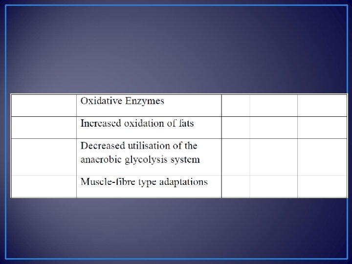 Increased glycolytic capacity: • Enhanced muscular storage of glycogen and increases in the levels of glycolytic enzymes. • Capacity of the anaerobic glycolysis system to produce energy is enhanced