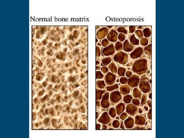 Osteoporosis § Condition in which there is a progressive loss of bone tissue. § Healthful behaviors during teen years can reduce your risk of developing osteoporosis later in life. § Can be detected by a bone scan. § Behavioral factors – lack of physical activity, lack of calcium and vitamin D in diet. § Environmental factors – none identified