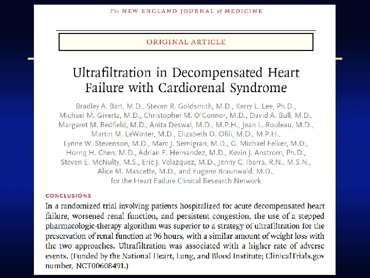 Ultrafiltration in Heart Failure § Initial data was generated in heart failure with low ejection fraction (HFLEF) § Costanzo et al. reported on 200 patients randomized to intravenous diuretics or ultrafiltration § No differences in serum creatinine between the two treatments Costanzo et al. J Am Coll Cardiol 2007; 49: 675 -683