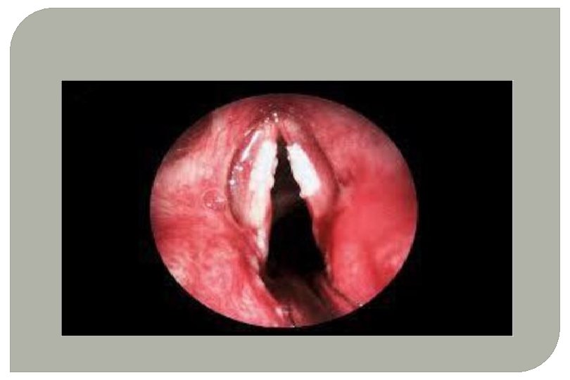 Signs • Congested vocal cords • Ulcerations - mouse-nibbled appearance of VC • Superficial ragged ulcerations on the arytenoids and interarytenoid region