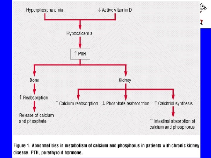 Renal osteodystrophy • Pathogenesis 1. Secondary hyperparathyroidism - Hypocalcemia is the main stimulus for triggering hyperparathyroidism in CKD. - Decreased GFR reduce the excretion of phosphorus, which form chemical complexes with Ca, causing calcium loss and the onset of secondary hyperparathyroidism, thus trying to eliminate excess P serum.