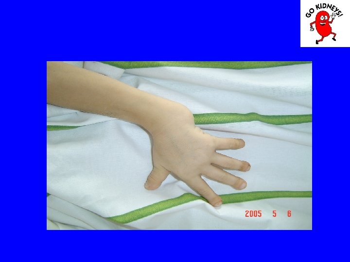 Diagnosis • Physical examination may be noted: - delays in growth - presence of signs of rickets or pathological fractures, - high BP. • Laboratory tests show that: - anemia normochromic, normocytic, aregenerativa. - Nitrogen retention and decreased creatinine clearance - metabolic acidosis, hyperkalemia, hyperphosphatemia, - hypocalcemia, hyponatremia - proteinuria or hematuria urinary sediment suggesting glomerular disease old. - low urinary density suggesting a chronic kidney ailment. • Renal ultrasound may show decreased volume of the kidneys • Bone radiography signs of renal osteodystrophy. • Retrograde cystography may help in the diagnosis of reflux nephropathy. • Radioisotope study can give differentiated data for each kidney function.