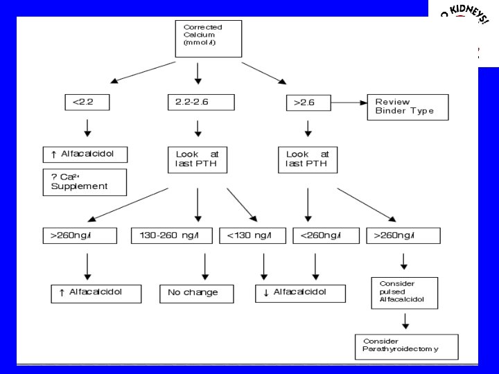 Follow up • Should be monitored: Serum calcium (negative effect is the production of hypercalcemia). P> 70 Ca Fosforemia when produced as � deposition can occur in tissues and vessels. Suppression of PTH may promote disease Adynamic. FA decline and PTH are markers of favorable outcome.