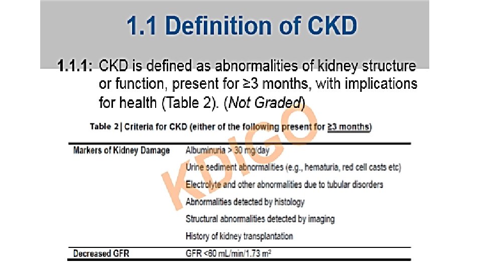 Staging • Chronic kidney disease (CKD) encompasses a spectrum of different pathophysiologic processes associated with abnormal kidney function and a progressive decline in glomerular filtration rate (GFR), present for >3 months.
