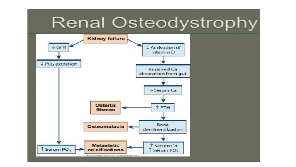 Musculoskeletal system • Renal osteodystrophy • Syndrome of skeletal changes • Result of alterations in calcium and phosphate metabolism • Weaken bones, increase fracture risk • Two types associated with ESRD: • Osteomalacia • Osteitis fibrosa