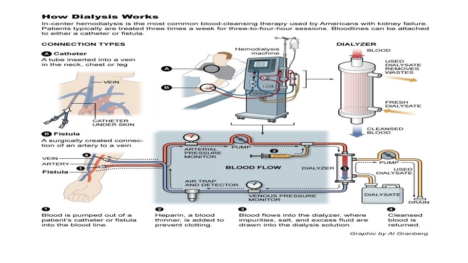 Types of Dialysis • continuous renal replacement therapies (CRRTs) • slow low-efficiency dialysis (SLED) • intermittent hemodialysis session • Peritoneal dialysis • continuous ambulatory peritoneal dialysis (CAPD) • continuous cyclic peritoneal dialysis (CCPD)