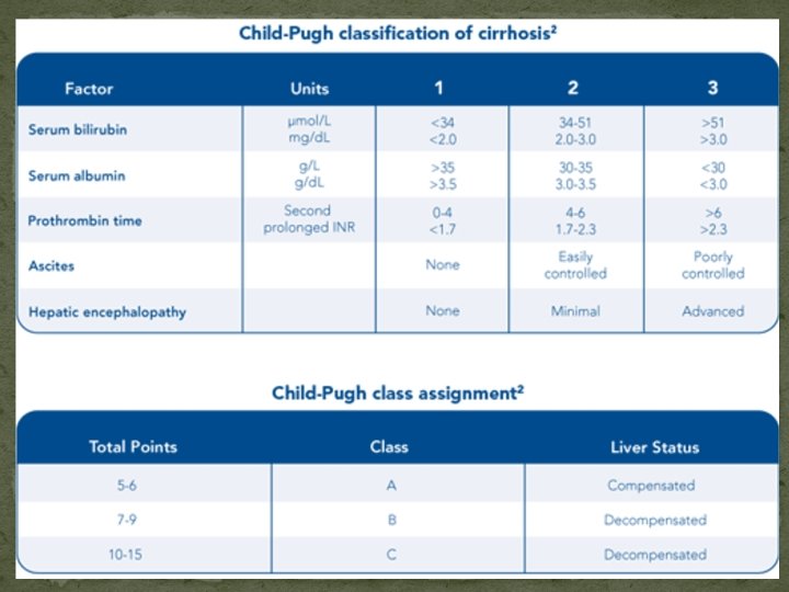 Course and Prognosis � This is extremely variable, depending on many factors, including the aetiology and the presence of complications � Development of any complication usually worsens the prognosis � In general, the 5 -year survival rate is approximately 50%, but this also varies depending on the aetiology and the stage at which the diagnosis is made � There a number of prognostic classifications based on modifications of Child’s grading (A, B and C) and the model for end-stage disease (MELD), based on serum bilirubin, creatinine and INR, which is widely used as a predictor of mortality in patients awaiting liver transplantation.