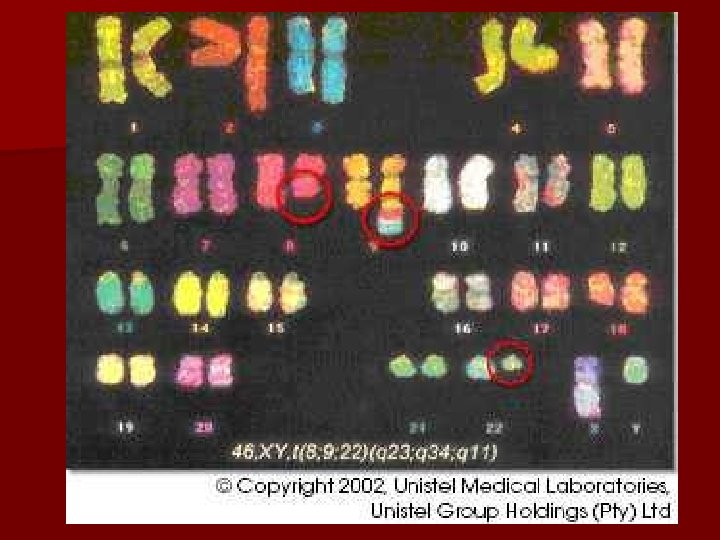 How you are diagnosed n Usually by accident! Routine WBC test shows elevated leukocytes n Confirmed with bone marrow biopsy and FISH and/or PCR that shows presence of Philadelphia Chromosome n Presence of myeloid cells in peripheral blood determines staging of disease n n S/SX: lethargy, pallor, night sweats, weight loss, anorexia, fever, lymphadenopathy, splenomegaly