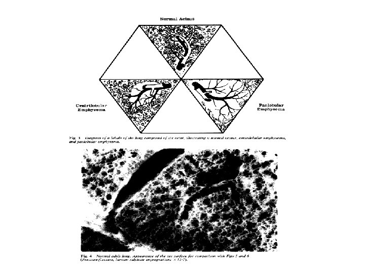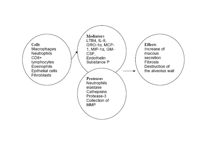 Pathogenesis • Protease anti Protease Theory – Hereditary deficiency of the major protease inhibitors – Laurell and Eriksson – 1963 – deficiency of α 1 -antitrypsin and emphysema • Pollutants in environment – smoking of cigarettes – exhalations from cars, dust from grain • Recruitment of neutrophils • stimulation of macrophages and epithelial cells to produce TNFα, IL-8 and LTB 4 • Elastase release from leukocytes and tissue macrophages • Inactivation of α 1 -antitrypsin by oxidants in tobacco smoke or free radicals released from the neutrophils
