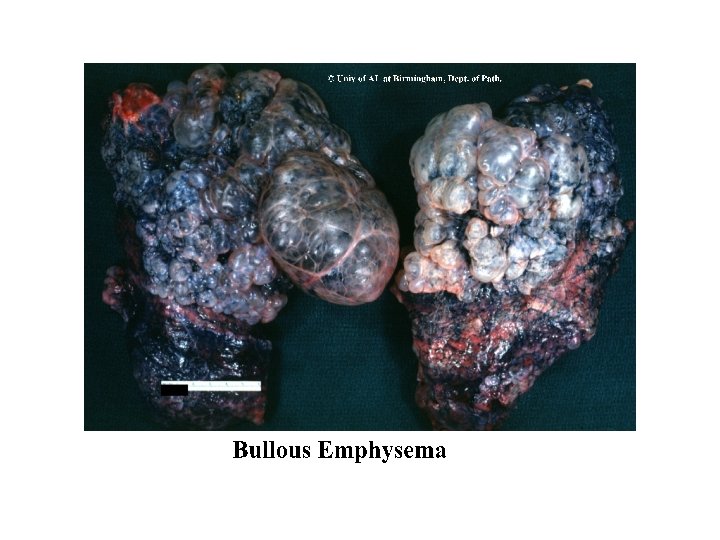 Cont • In advanced emphysema, the lungs are large, pale, and relatively bloodless. • They do not readily collapse. • They many contain many superficial blebs or bullae, which occasionally are huge. • The right ventricle of the heart is often enlarged (cor pulmonale), reflecting pulmonary arterial hypertension.