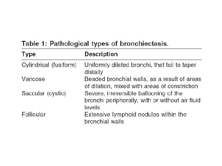 Follicular Bronchiectasis • The fourth type of bronchiectasis is called follicular and is characterized by extensive lymphoid nodules within the bronchial walls. • It usually occurs following childhood infections