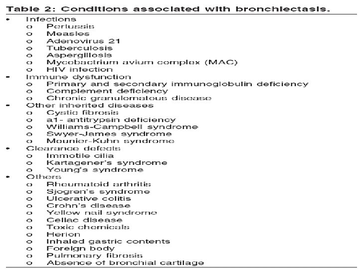 Cont. • Repeated or prolonged episodes of pneumonitis, • Inhaled foreign objects or • Neoplasms have been known to cause bronchiectasis. • When the bronchiectatic process involves most or all of the bronchial tree, whether in one or both lungs, it is believed to be genetic or developmental in origin